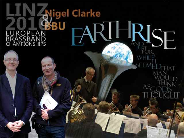 Conductor Luc Vertommen and Brass Band Buizingen presented Nigel Clarke with a specially deigned photograph to thank him for composing `Earthrise’. The presentation took place before the Euro Brass Championships. The collage was designed by Lut Mols the wife of a previous member of Brass Band Buizingen. After the presentation the Band gave yet another stunning performance of `Earthrise’ in the Euro Brass Championships, Drachten, Netherlands.